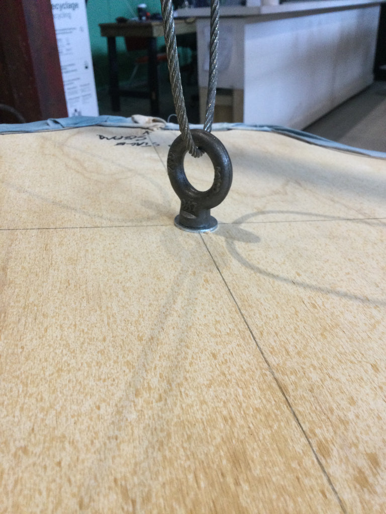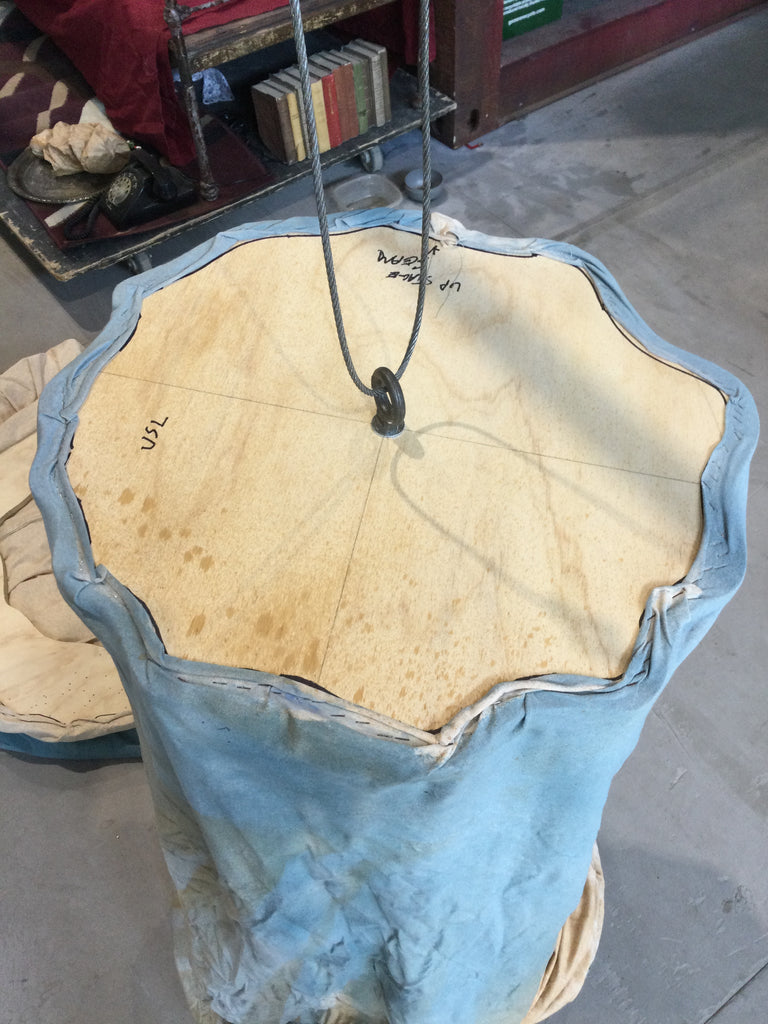 - Spécificités : A été utilisé pour une pièce de théâtre. Les extrémités sont maintenues par des plaques rondes en contreplaqué. Comporte un système d'attache avec une œillère.