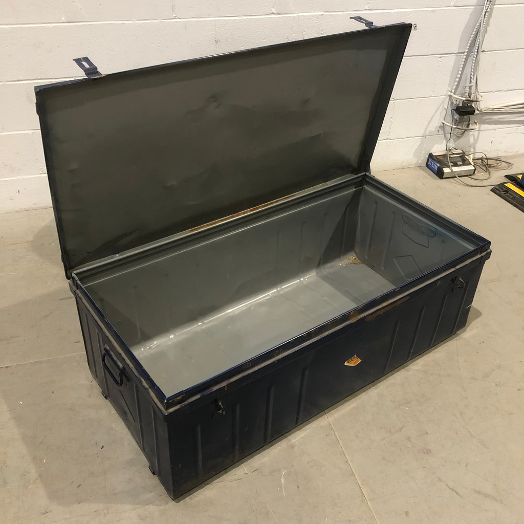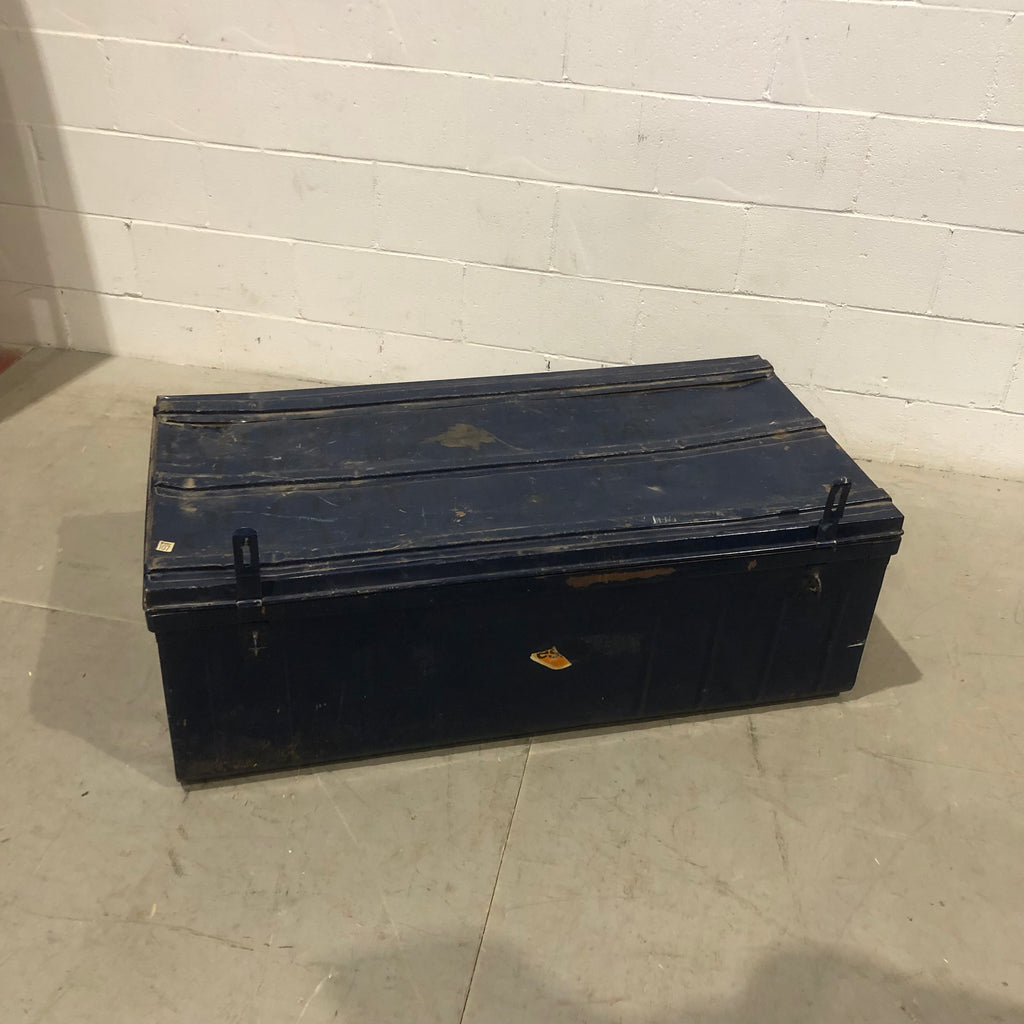 - Spécificités : Coffre bleu en métal avec poignées et loquets