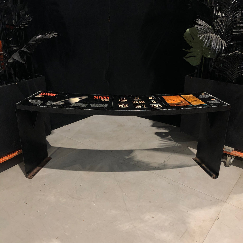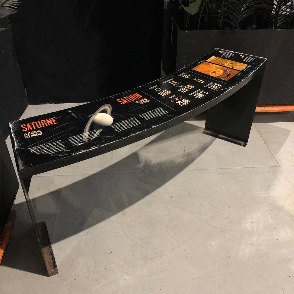 - Spécificités : Présentoirs extrêmement solides, de qualité muséale. Les vinyles de textes sont aisément décollables et remplaçables. Quelques écailles de peinture sont visibles dans le bas de la structure. 4 trous permettent de boulonner chaque présentoir au sol de façon sécuritaire.
