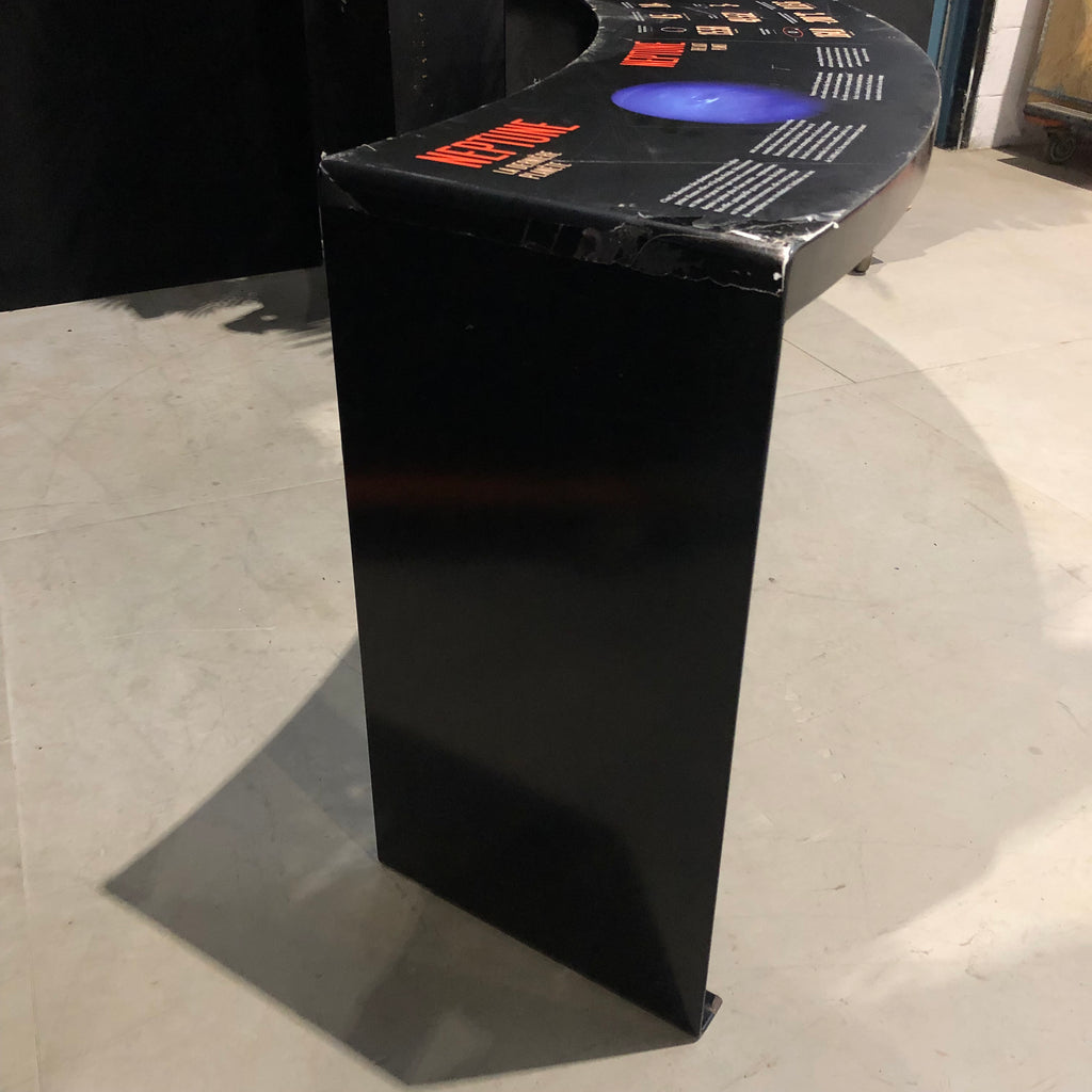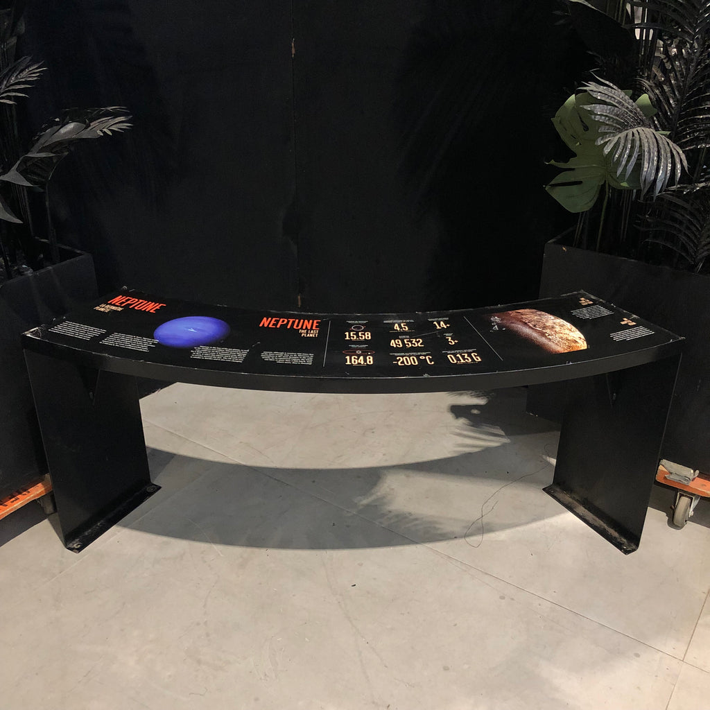- Spécificités : Présentoirs extrêmement solides, de qualité muséale. Les vinyles de textes sont aisément décollables et remplaçables. Quelques écailles de peinture sont visibles dans le bas de la structure. 4 trous permettent de boulonner chaque présentoir au sol de façon sécuritaire.