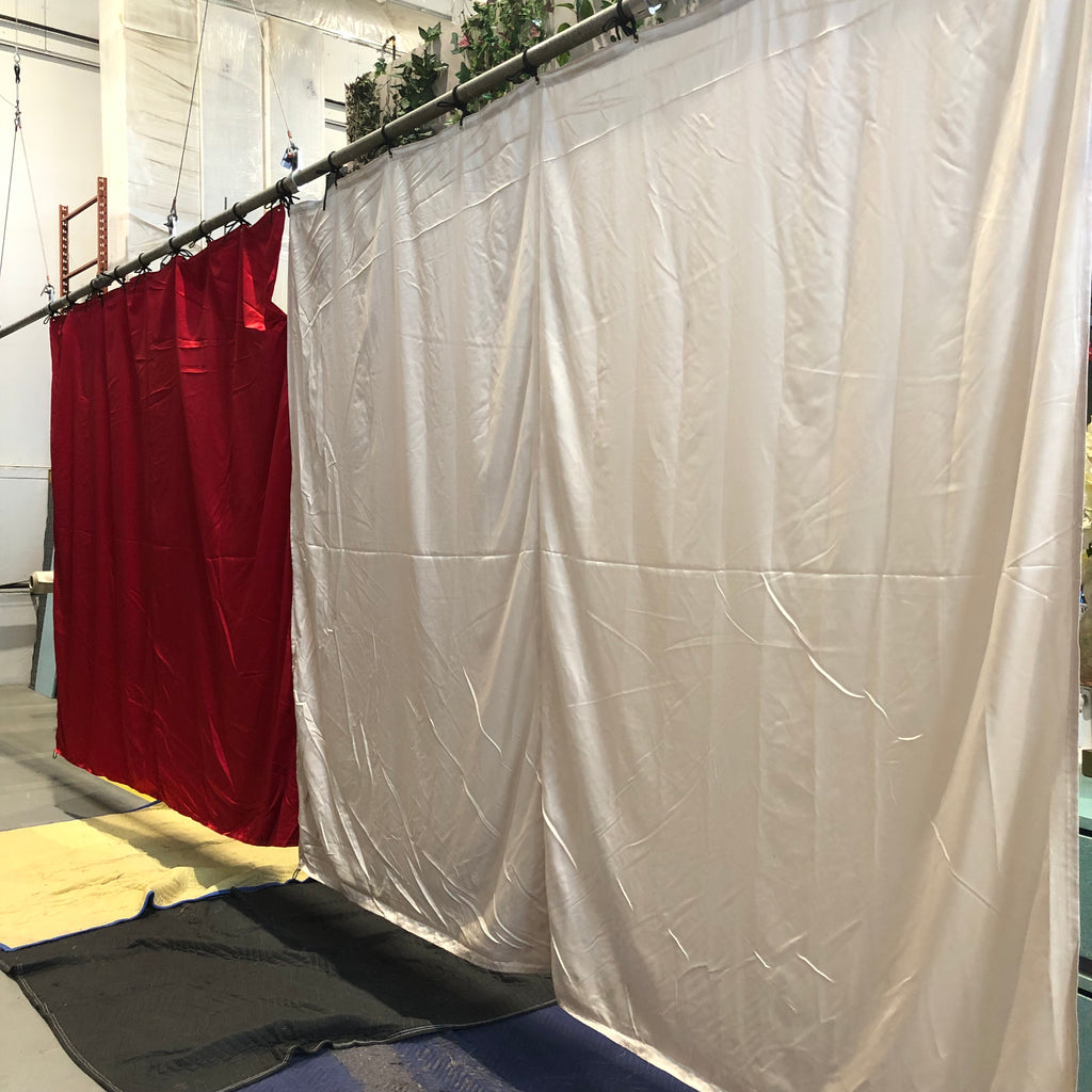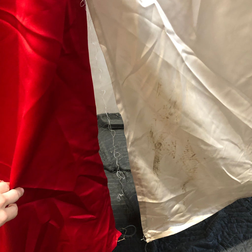 - Spécificités : Rideau satiné de 2 couleurs. Décousure aisément réparable dans le bas à la jointure des deux pans. Alternativement, les deux pans peuvent être décousus et utiliser de façon indépendante. Une petite tâche nettoyable est visible dans le bas du pan blanc.