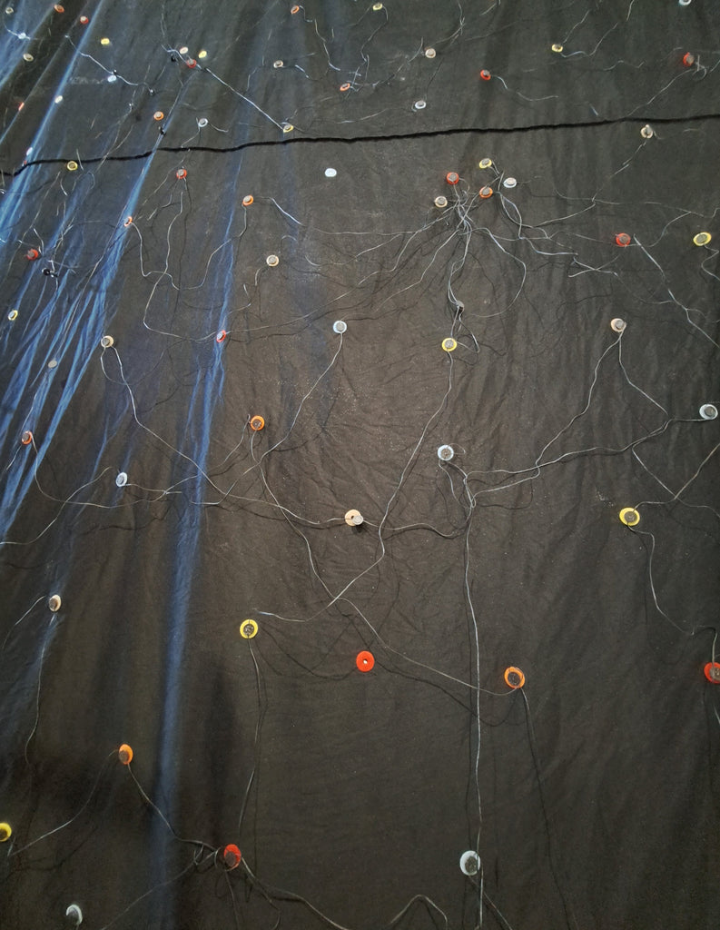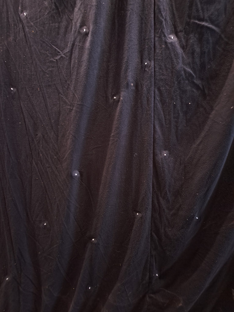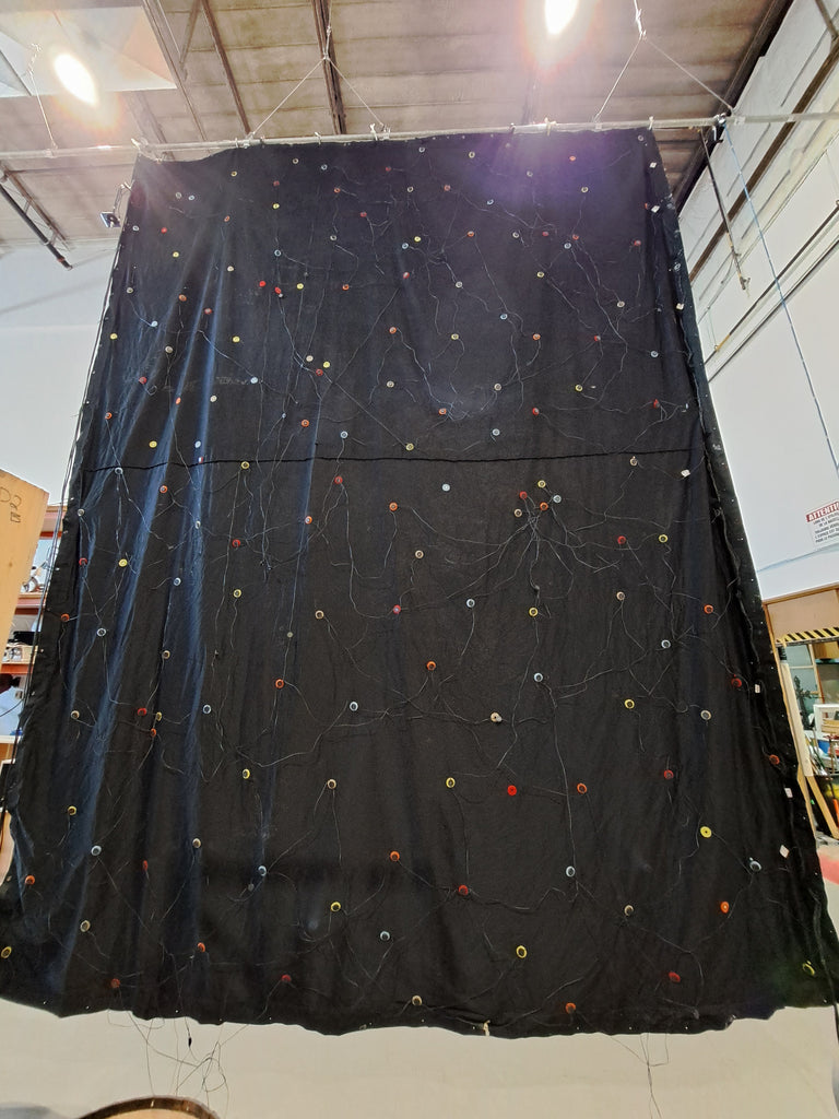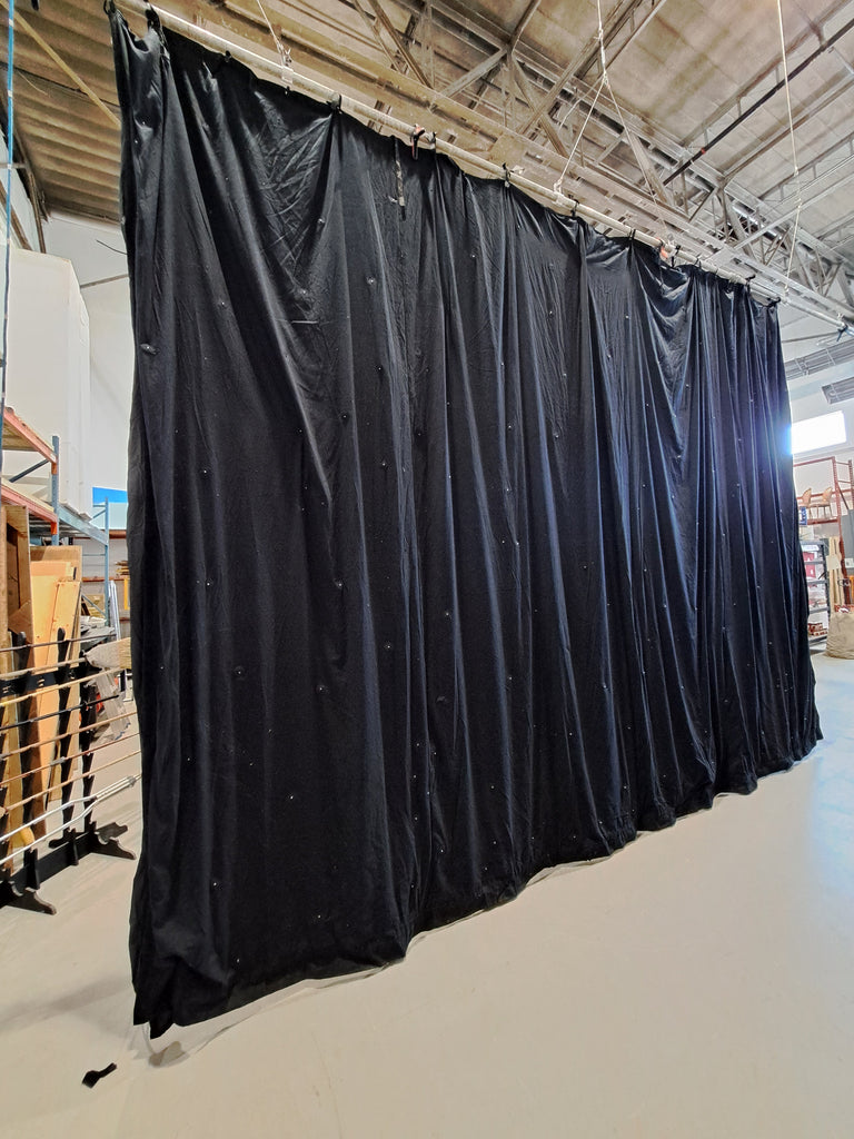 - Type de matière : Grands rideaux en tissu feutré noir avoir système de LED intégré. Les LED forment un motif de ciel étoilé. Le système électrique à l'arrière du rideau est recouvert par un tissu léger noir fixé à l'aide de velcro.