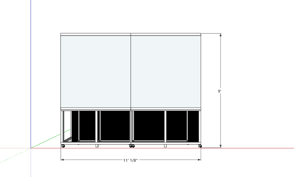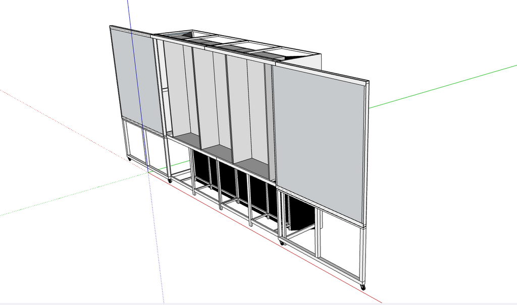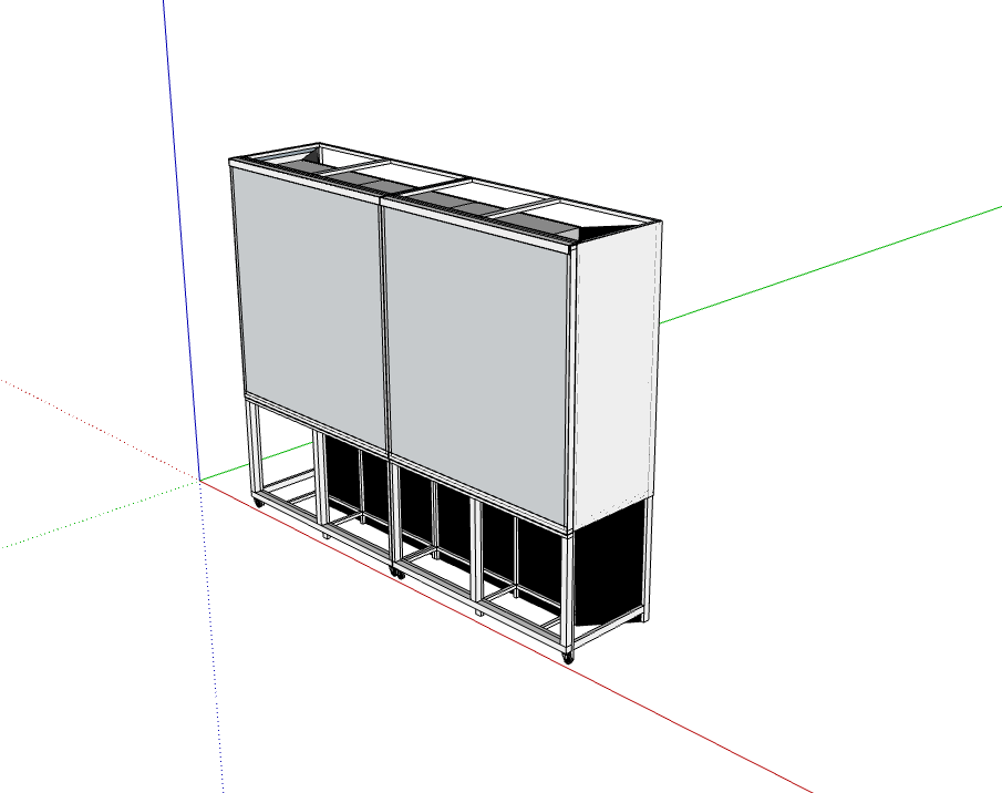 Cette structure mobile est composée de trois bibliothèques en contreplaqué avec LED intégrées soutenues par une structure en aluminium. Deux panneaux sur roulettes permettent de fermer les bibliothèques.