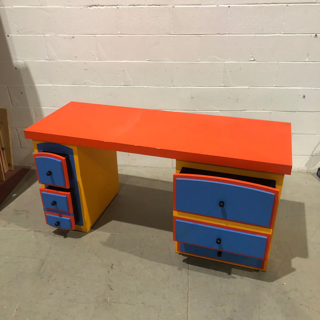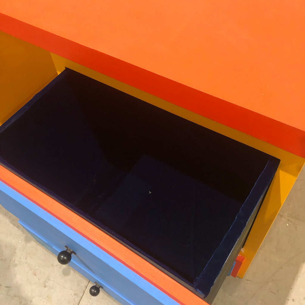 - Spécificités : Bureau sur pattes aux couleurs vives. L'intérieur des tiroirs est feutré. Le meuble est conçu pour être utilisé comme un praticable.