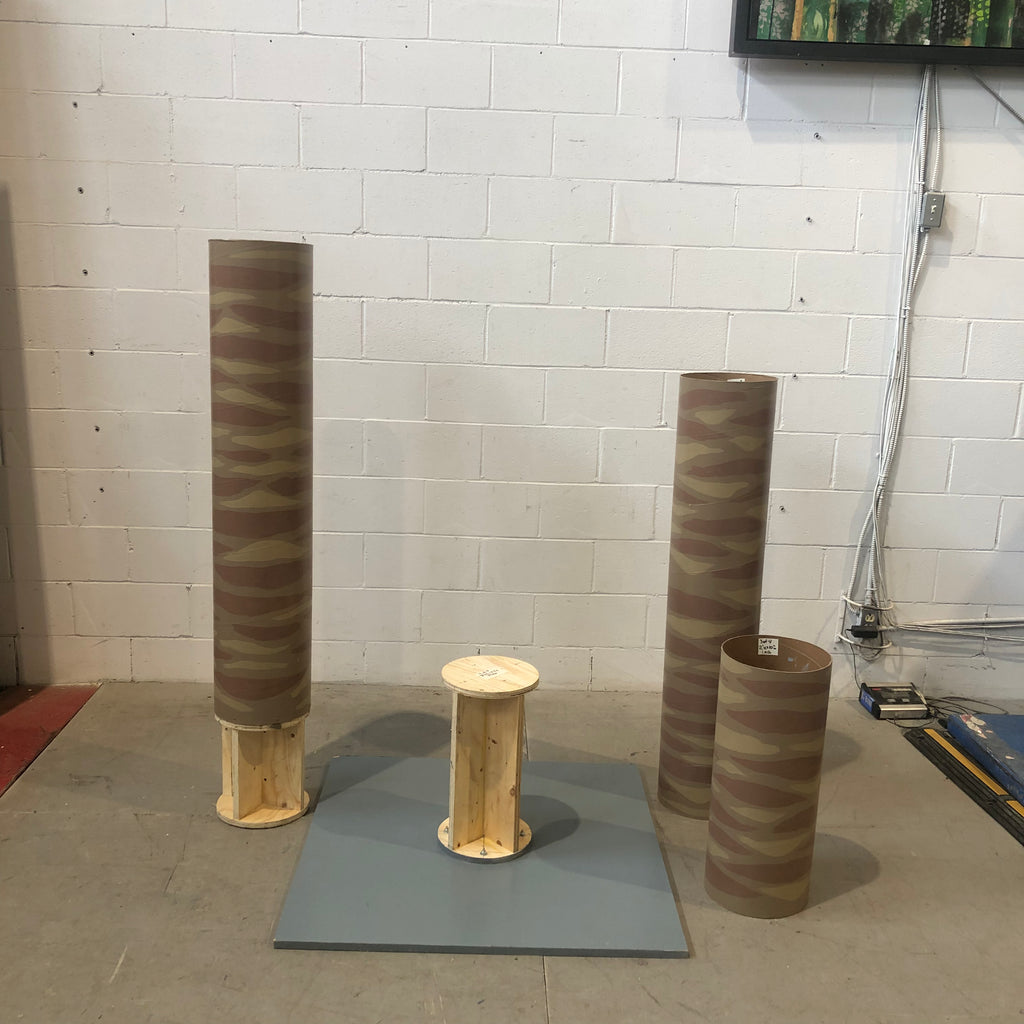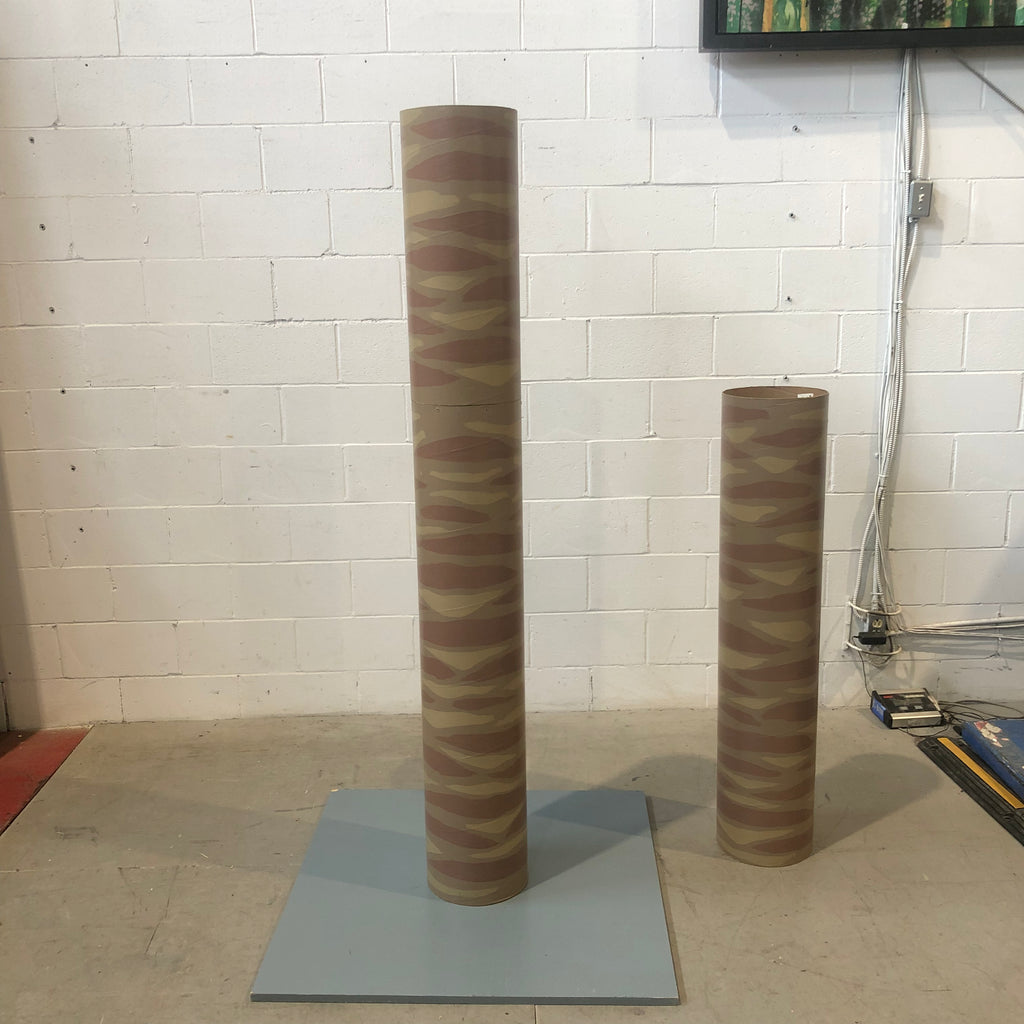 - Spécificités : Trois colonnes cylindriques (tubes en carton robuste) peintes en motif camouflage dans des tons de brun et khaki. Certaines colonnes s'emboitent les unes dans les autres, permettant des hauteurs variées selon les besoins de la production. La base en bois peint gris a aussi un support cylindrique vissé sur la plateforme carrée. Vendu en lot.