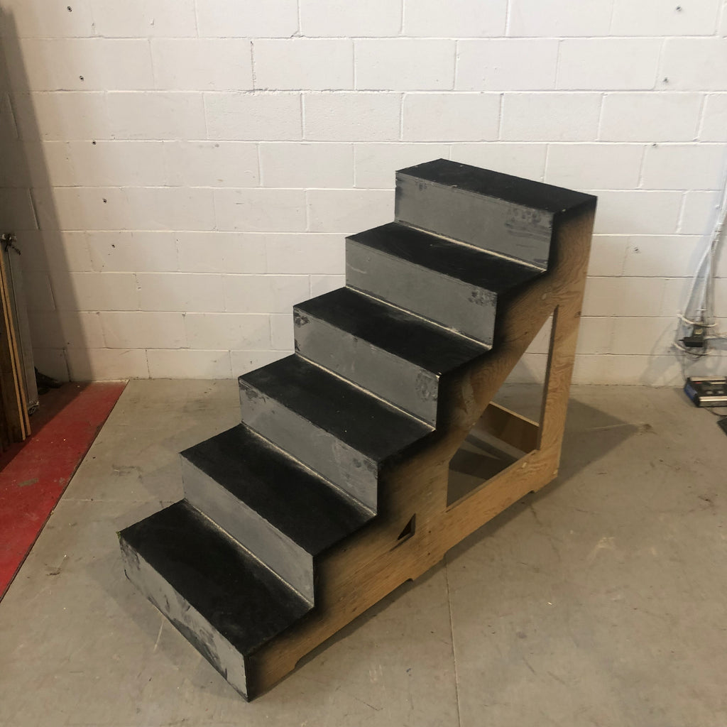 - Spécificités : Escaliers autoportants comportant 6 marches. Du tapis noir est agrafé sur chaque marche.