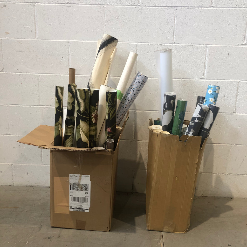 Papier peint de taille et motif variés. Certains rouleaux sont entammés et d'autres sont neufs dans leur emballage.