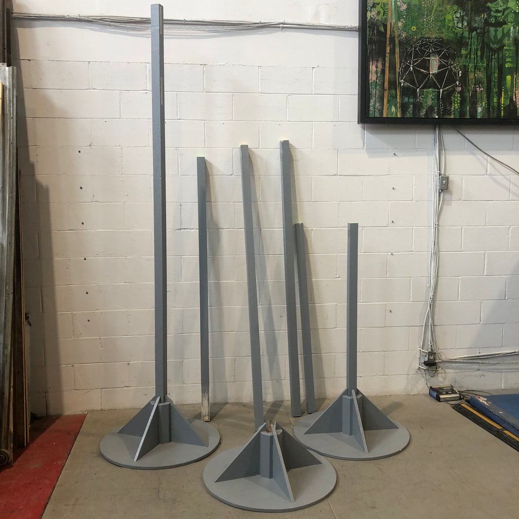 - Spécificités : Six poteaux interchangeables de longueurs variées avec trois bases solides compatibles. Idéal pour des ateliers, des salles de répétition, des écoles. Tous les éléments sont en bois et peints gris. Vendu en lot.